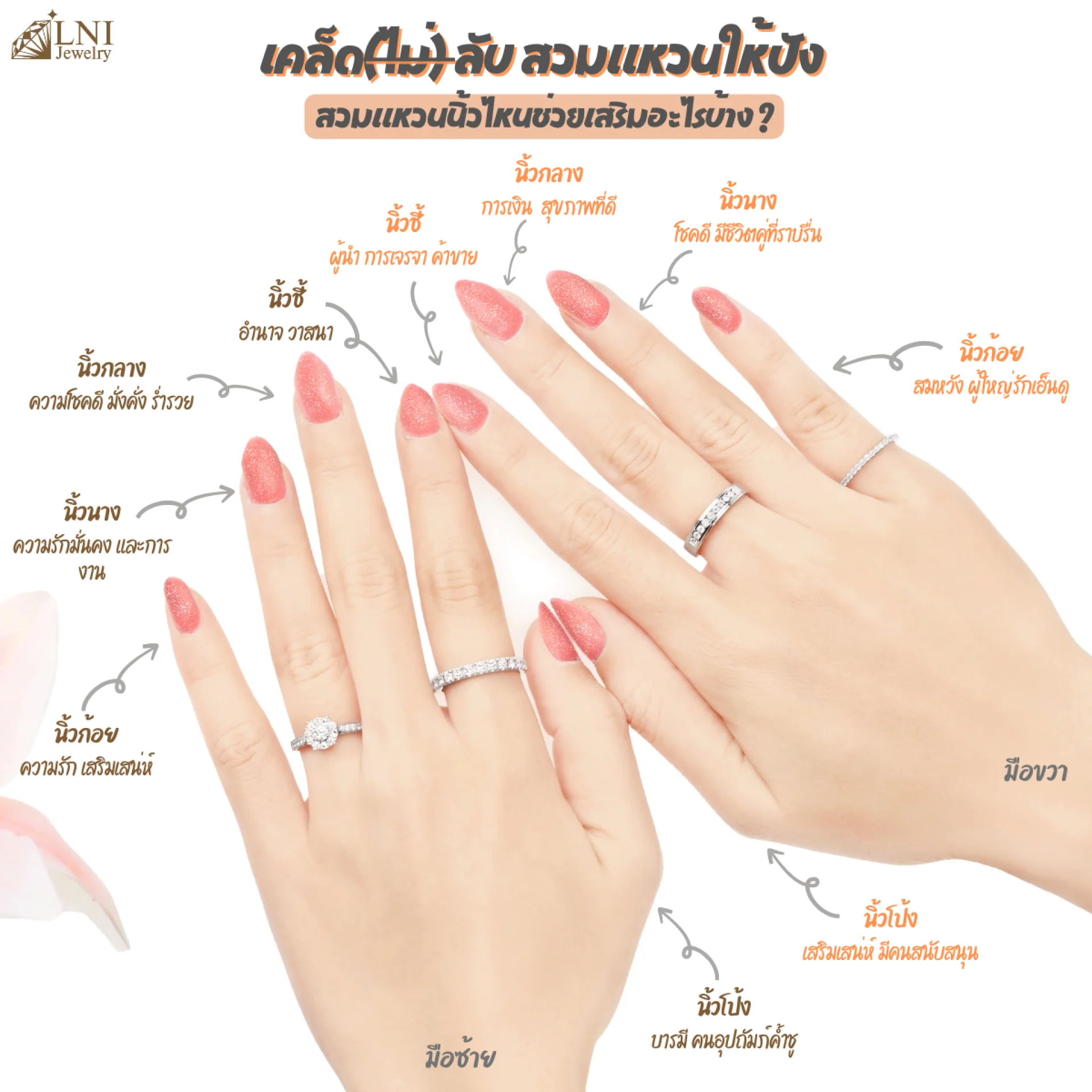 - การสวมแหวน นิ้วนางข้างซ้าย จะช่วยเสริมในเรื่องของความรักที่มั่นคง และในเรื่องของการงาน